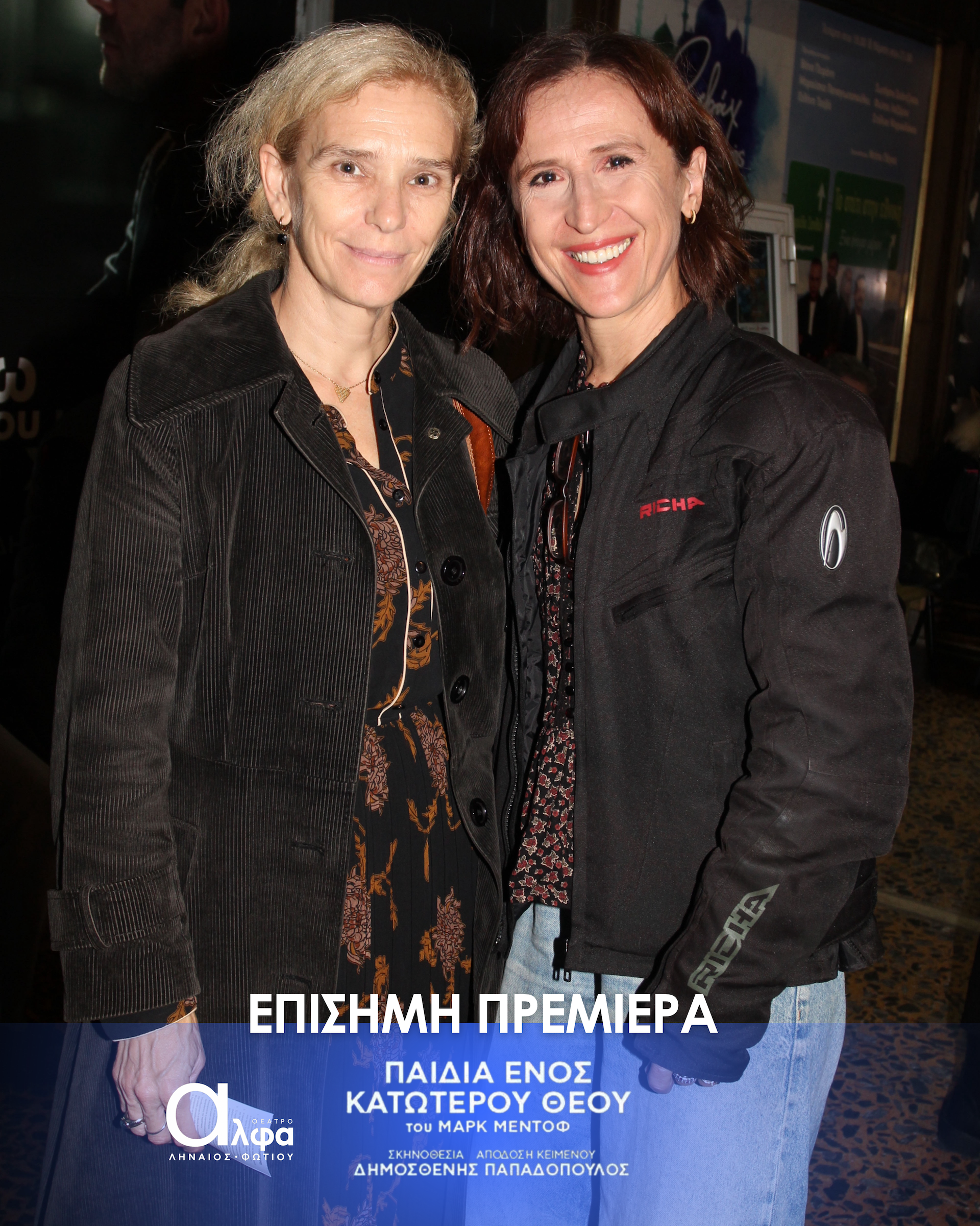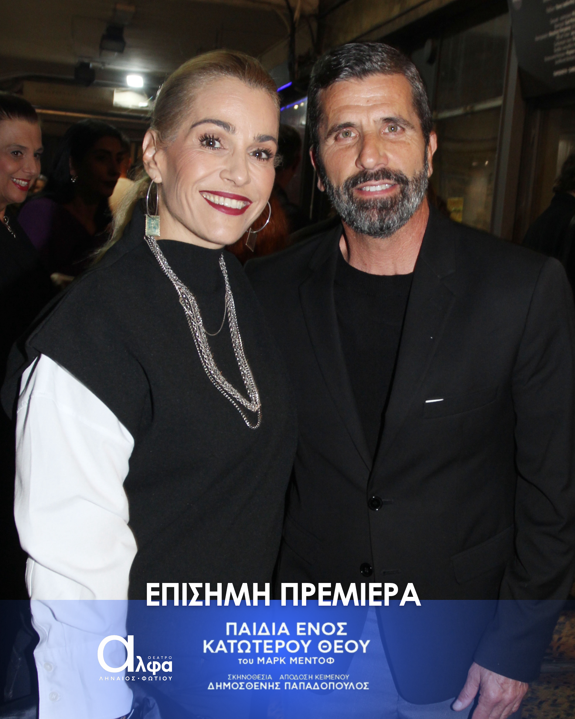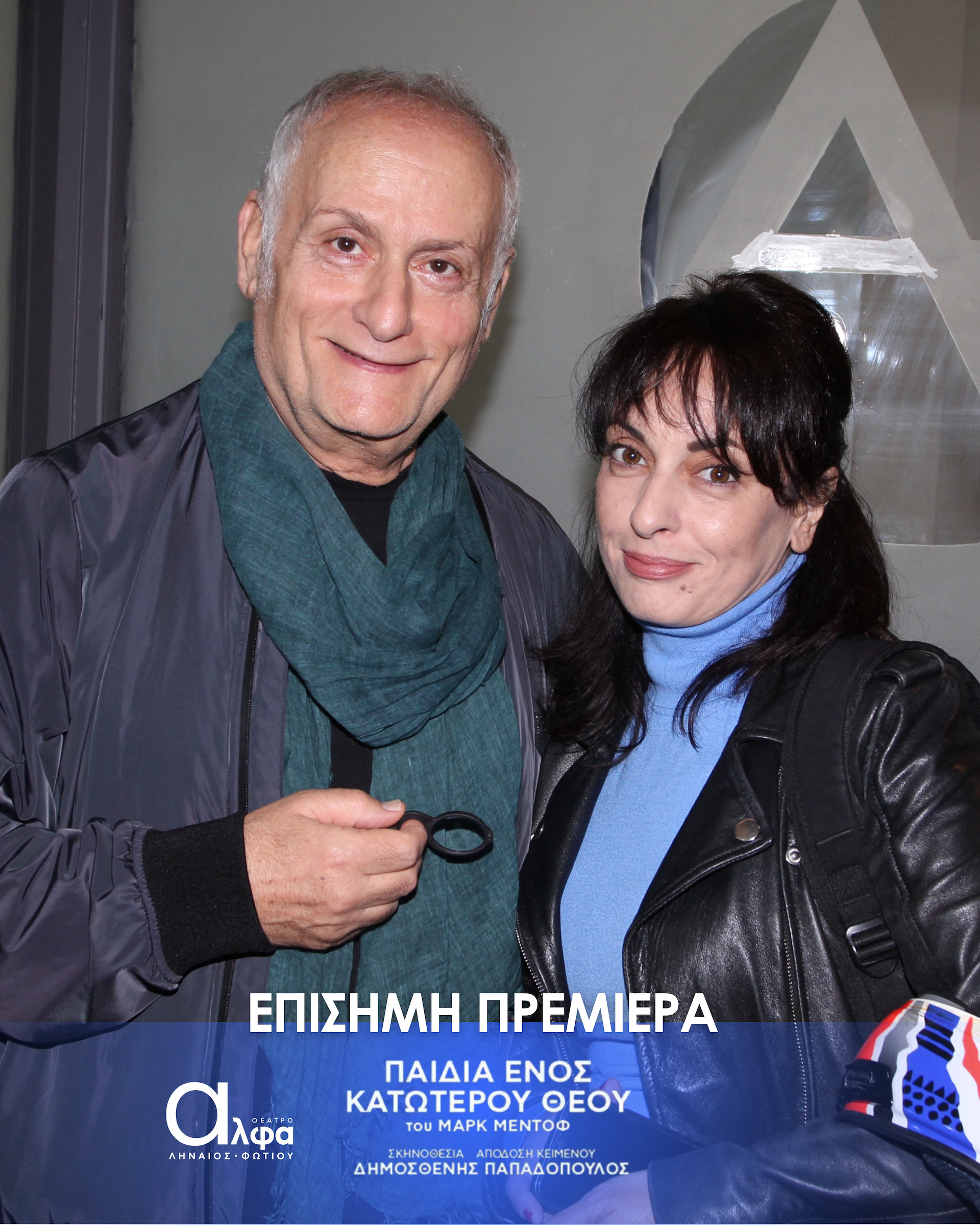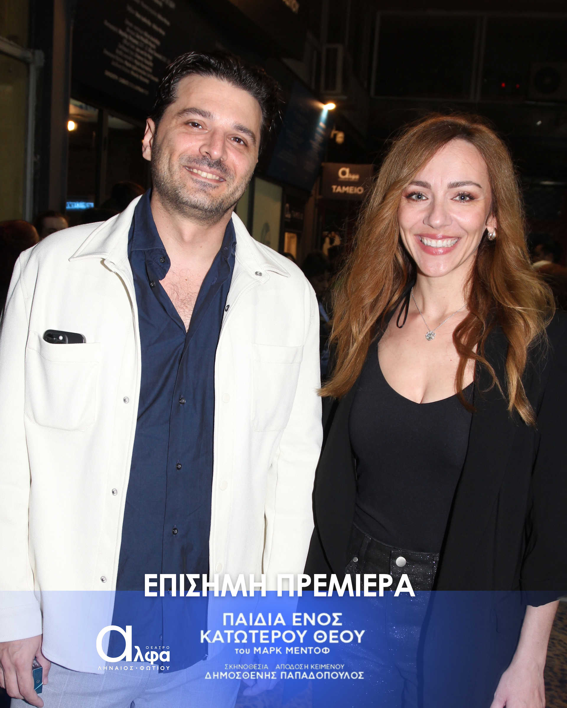 Η επίσημη πρεμιέρα της παράστασης «Τα Παιδιά ενός Κατώτερου Θεού» έλαβε χώρα στις 3 Νοεμβρίου στο Θέατρο Άλφα Ληναίος Φωτίου και το κοινό υποδέχτηκε το πολυβραβευμένο θεατρικό έργο του Μαρκ Μέντοφ με ενθουσιασμό και συγκίνηση. Στην εκδήλωση το “παρών” έδωσε πλήθος γνωστών ηθοποιών και φίλων.Ανάμεσά τους οι Tάσος Ιορδανίδης, Θάλεια Ματίκα,, Αννυ Λούλου, Άσπα Τομπούλη, Μαρία Ακουλά, Γιώργος Καραμίχος, Γιώργος Μπένος, δΔμητρα Κόλλα, Παναγιώτης Πετράκης, Μυρτώ Αλικάκη, Τζένη Μπότση, Θανάσης Βισκαδουράκης, Μαίρη Σταυρακέλλη, Ζωή Κρονάκη, Γιούλη Τσαγκαράκη, Θάνια Ιορδανίδου.