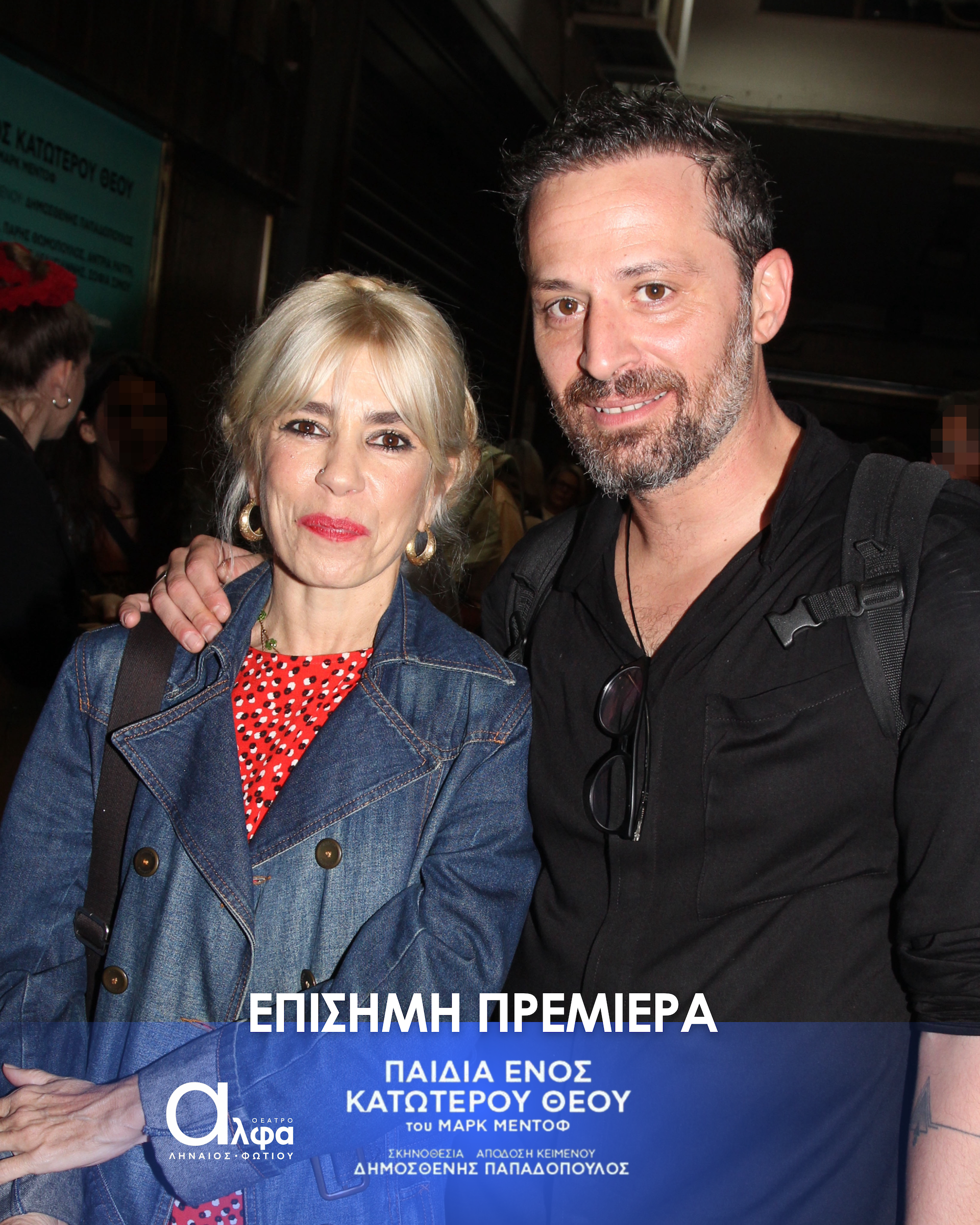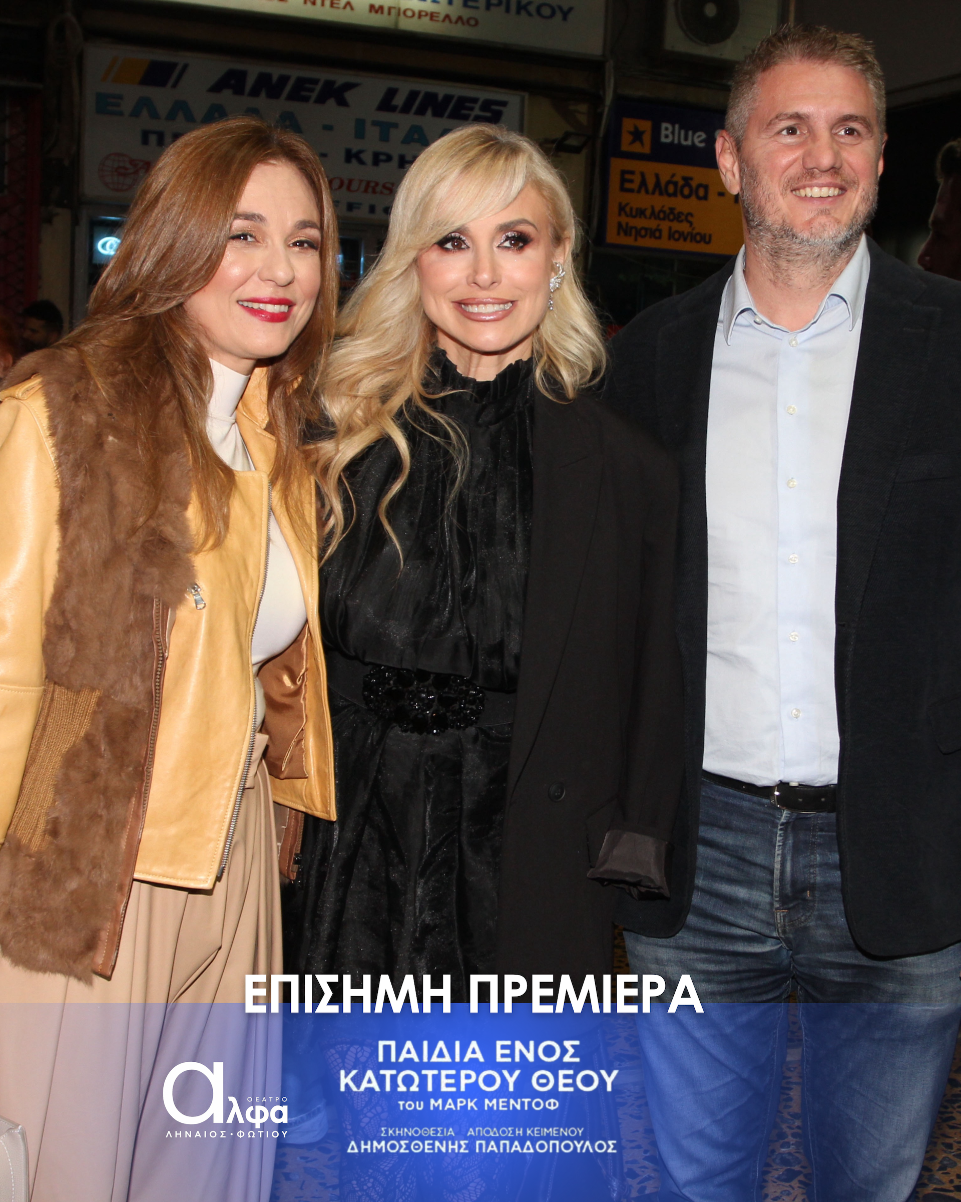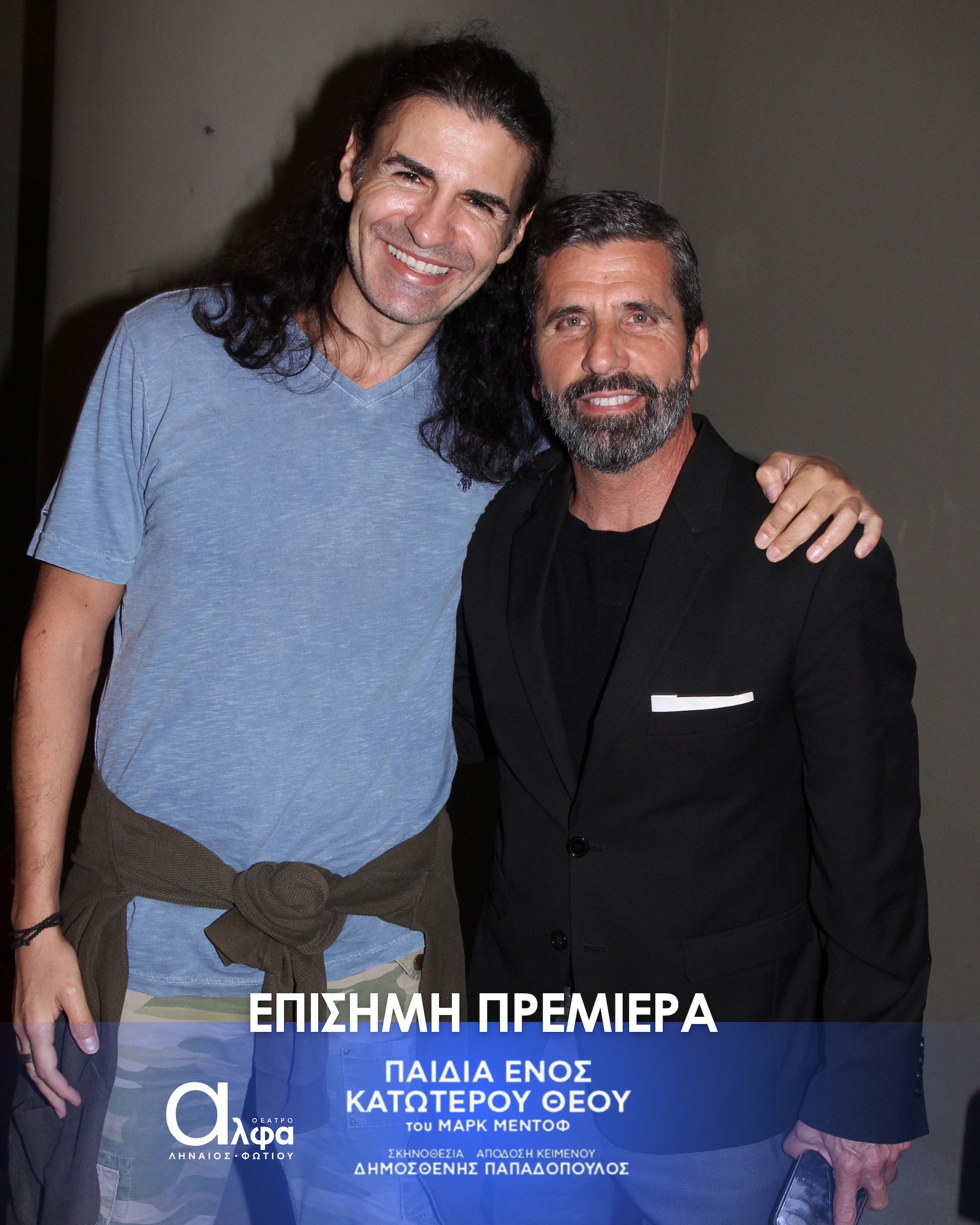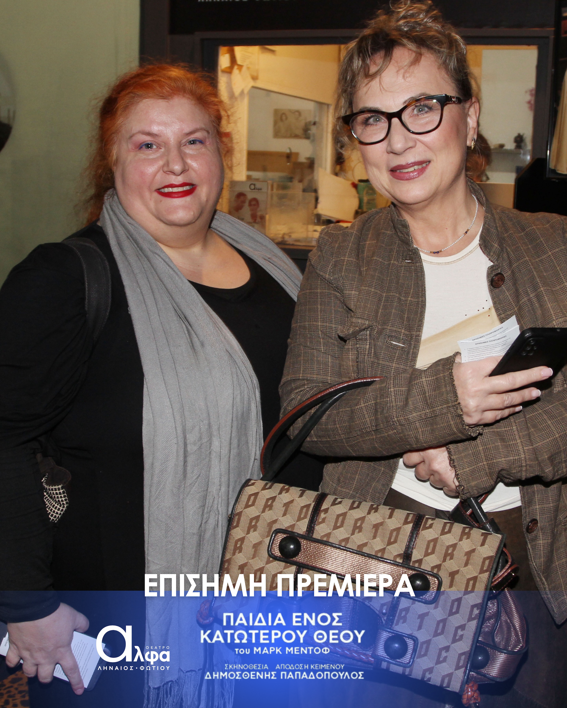 Η επίσημη πρεμιέρα της παράστασης «Τα Παιδιά ενός Κατώτερου Θεού» έλαβε χώρα στις 3 Νοεμβρίου στο Θέατρο Άλφα Ληναίος Φωτίου και το κοινό υποδέχτηκε το πολυβραβευμένο θεατρικό έργο του Μαρκ Μέντοφ με ενθουσιασμό και συγκίνηση. Στην εκδήλωση το “παρών” έδωσε πλήθος γνωστών ηθοποιών και φίλων.Ανάμεσά τους οι Tάσος Ιορδανίδης, Θάλεια Ματίκα,, Αννυ Λούλου, Άσπα Τομπούλη, Μαρία Ακουλά, Γιώργος Καραμίχος, Γιώργος Μπένος, δΔμητρα Κόλλα, Παναγιώτης Πετράκης, Μυρτώ Αλικάκη, Τζένη Μπότση, Θανάσης Βισκαδουράκης, Μαίρη Σταυρακέλλη, Ζωή Κρονάκη, Γιούλη Τσαγκαράκη, Θάνια Ιορδανίδου.